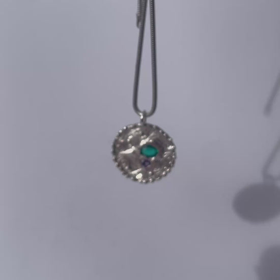 Inspired by the beauty of traditional Māori design elements and created with deep respect for Aotearoa’s culture, this hand-engraved pendant features two zirconia stones in green and purple – symbolizing balance between nature and spiritual clarity.